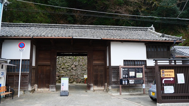 | 宇和島城を訪れるには公共交通機関での移動はロスタイムが多くレンタカーにしました。 宇和島城の登城口が見当たらず探すために勝山の周りを周回してしまいました。 “宇和島城”の小さな看板を見つけ進むと正面に“大手門”と思われる門の前に到着しました。 筆頭家老の桑折屋敷の門を移設された『藩老桑折氏武家長屋門』でした。今見れは門幅が狭かったです。 |