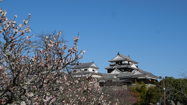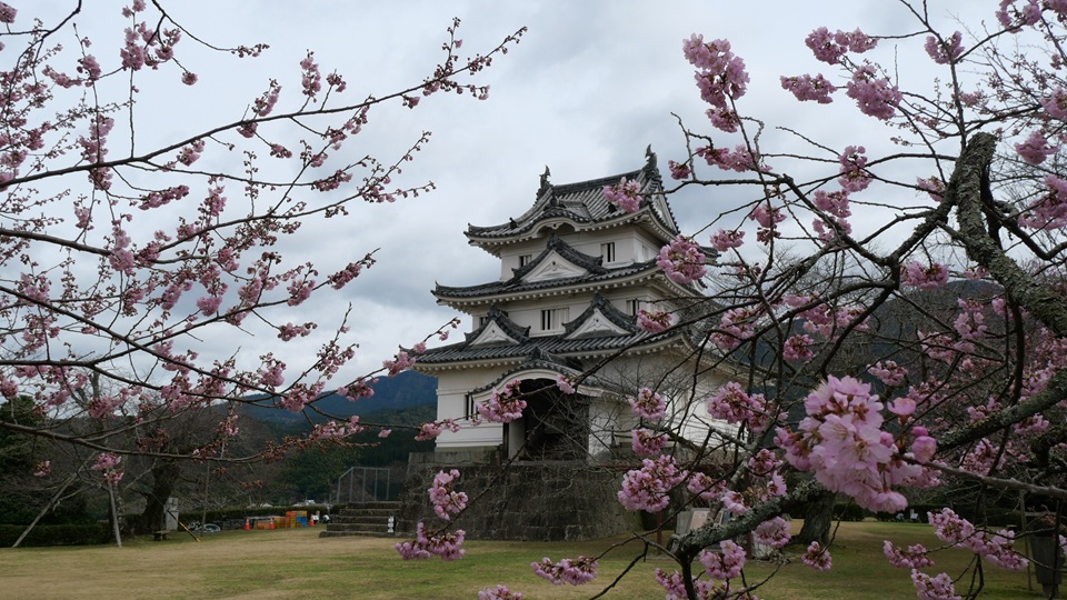 | 宇和島城は現存12天守閣の一つ。 2025年3月6日の天守閣台では『ウスベニカンザクラ』が咲きほころんでいます。でも、『ソメイヨシノ』のつぼみは固く閉ざしていました。 |