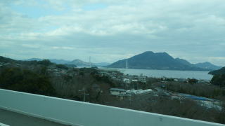 | 今治城天守最上階から北方を眺めると、遠くの海に大橋が見えるのが『しまなみ海道』。帰りは今治駅から福山駅への高速バスに乗り縦断する。 |