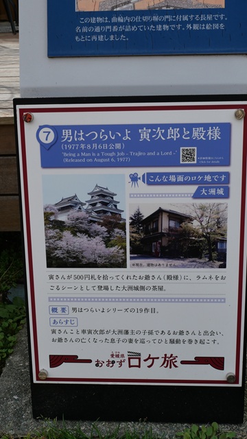 『男はつらいよ 寅次郎と殿様』 1977年に公開されたシリーズ19作目。 30年前に”男はつらいよ”のロケ地でしたか?” と尋ねると”50年前です、”と正されました。 殿様は” 嵐寛寿郎”、マドンナは”真野響子”。殿様の嵐寛寿郎と寅さんとの掛け合い、殿様とマドンナ真野響子の掛け合いがユーモラスに溢れほのぼのとしていて、荒川の土手を嵐勘十郎と真野響子のシルエット姿が旅情に溢れて素晴らしかった。 テレビのバラエティ番組で、宿泊できるお城として、大洲城が紹介されています。 天守閣の1階に布団を引いて寝るみたいです。 広い城内で甲冑が展示されている部屋で寝るのはちょっと抵抗があります。 一泊二日おひとり様308千円で最大6名まで利用できるそうです。 |