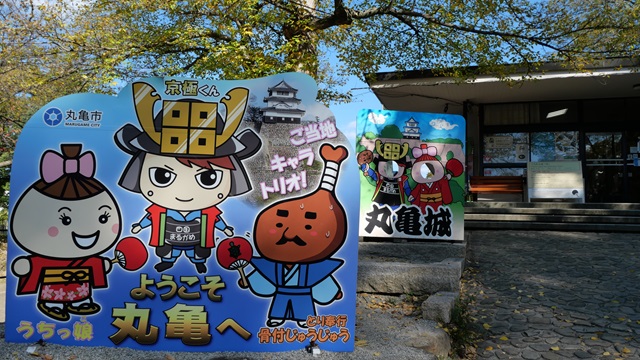 | さて、丸亀城のマスコット。 観光案内所前に置かれているパネルの公認キャラクター。 真ん中は“きょうごくくん”。見ると”ロンドンブーツの田村淳”に似ているように思えるのは私だけ?。 左は“うちゃ娘”。 右は“とり奉行 骨付きじゅうじゅう”。丸亀市名物だそうです。 |
