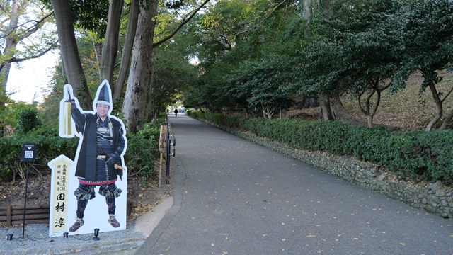 | 大手門通りの天守への“見返り坂”と呼ばれる急勾配の坂道があります。本丸へ物資を運ぶために車が通行する際は、歩行者は通行止めになります。安全のため協力しましょう。 登り口に、芸能人でお城に精通している”ロンドンブーツの田村淳”が大名の格好したパネルが置かれています。 芸能界でお城通と名高い田村淳。“お城の観光大使”に就任されているのが犬山城、松江城、福山城、丸亀城、高知城。あれ、福山城は現存12城ではないと思うが。 |