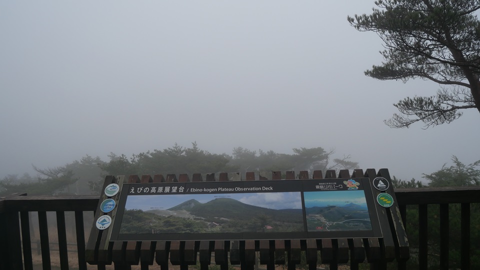 | 旅行前に週間天気予報では晴天で期待してきましたが、雲に覆われていました。 “えびの高原”は標高1,200m、えびの高原に着いたら曇り空。写真の中で聳えている“韓国岳”の先には高千穂峰があります(見えませんが)。 翌朝の“えびの高原”は霧にまみれで視界不良でした。 それでも最も近い“えびの展望台”まで登りました。登山道は整備され“アカマツ”林の間を通り抜け10分ほどで展望台に到着しました。 やはり“えびの展望台”からの景色は霧の中で、目の前の“韓国岳”さえ見ることが出来ませんでした。 |
