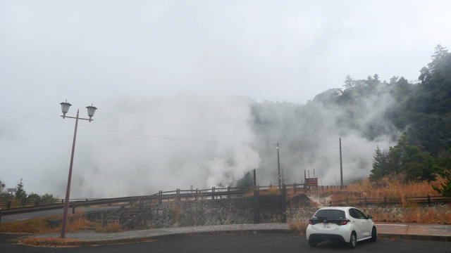 | “えびのスカイライン“を下って行くと『硫黄谷噴気地帯公園』に出ます。道路脇の谷から白い煙が噴出し空高く昇っています。駐車場があり停車し降りると硫黄の臭いが充満しています。 |