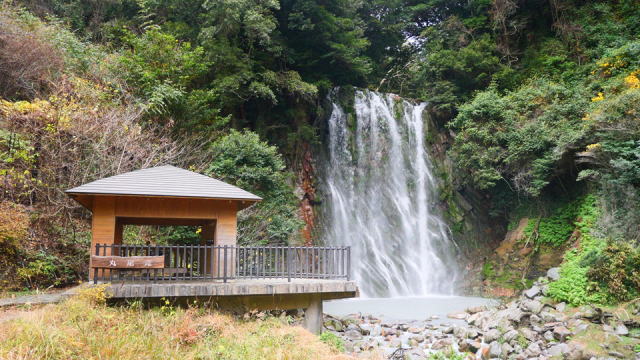 | 霧島温泉街 昭和55年に種子島から名古屋に3日間だけ帰ることになりました。この時、名古屋に帰らず南九州を旅行するため、霧島温泉の観光ホテルに飛び入りで宿泊し、部屋が山側で窓の外には野生のシカが出現したことを覚えています。 その霧島温泉に、温泉水が集まって落ちる「丸尾の滝」があります。高さ23m、幅16mと豪壮にして華やかな滝です。 |