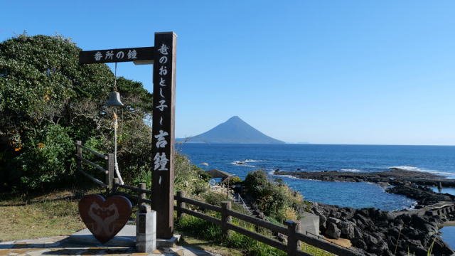 | 薩摩半島のほぼ先端にある開聞岳。東シナ海が展望できる海岸沿いに薩摩藩の番所があった所に“番所鼻自然公園(バンドパーク)“があり、美しい開聞岳を望むことが出来る撮影ポイントです。 『開聞岳と百名山』 -薩摩の秀峰- 別名「薩摩富士」とも称される標高924mの薩摩の秀峰。約4,000年前の火山活動で形成された比較的若い山で、当地より左側稜線に見える突起部分が元の山頂でしたが、874年と885年の大噴火で山頂が盛り上がり現在の姿となったものです。 「番所の鐘」。鳴らす回数によって祈願の種類が変わる「幸せの鐘」です。 |