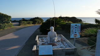 | 灯台へ行く途中に浦島太郎の石像があり、石像の周りを2回まわって亀をなでると、願い事がかなうといわれており、亀を触る人で行列ができます。浦島太郎の周りには、願い事の書かれた貝殻がたくさん置かれていました。 男性は左から二回まわる。 女性は右から二回まわる。 二回まわって亀を撫でたら 願い事が叶うと言われています。 |