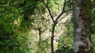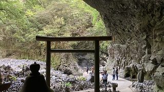 | 西本宮拝殿の右に施錠された扉があります。疎かに潜り降りていきますと、対岸に締め縄が掛けられている大きな岩の洞窟が見えます。奥行きは1~2m程度ですが高さ4~5mはあると思います。 対面に「遥拝殿」が建てられお参りします。 なお、岩戸は神々が力いっぱい開けたので長野県の戸隠まで飛んでいったそうです。 ここは当然撮影禁止ですが、参道の木々の隙間から微かに見る事ができたので撮影させていただきました。 |
