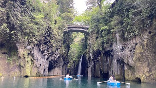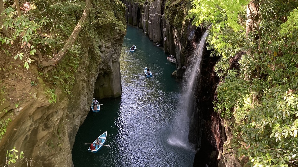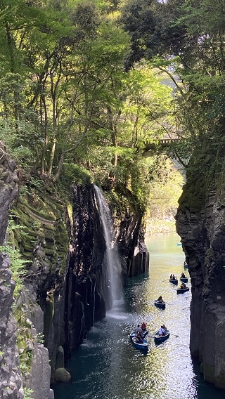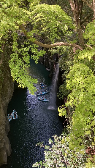 | 県道から五ヶ瀬川渓谷のボート乗り場まで降りていきます。急勾配の湾曲した道をしっかりした足で下っていきます。下ったところに五ヶ瀬川に掛かる「御橋」に出ます。 御橋からの高千穂渓谷は大岩に挟まれ緩やかな水面の流れにボートがひしめく様に浮かべられています。その水面に伏流瀑の「真名井の滝」が水飛沫を発しながら落ちていくのが分かります。 高千穂峡の代名詞ともいえる有名な滝で、日本の滝100選に選定されています。天孫降臨の際、この地に水がなかったため、天村雲命(あめのむらくものみこと)が水種を移した「天真名井」の水が滝となって流れ落ちているとされています。 |