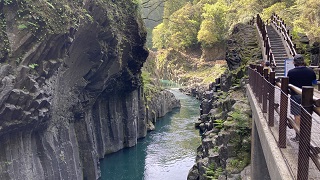 高千穂峡を望む遊歩道がありますが、令和4年9月17~19日にかけて通過した「台風14号」により遊歩道が水没し、ほとんど流され遊歩道が閉鎖されています。 |