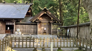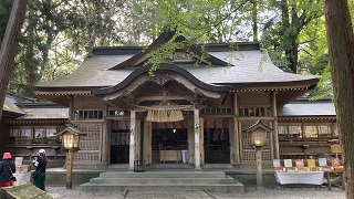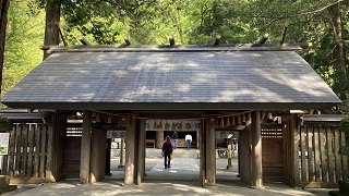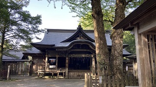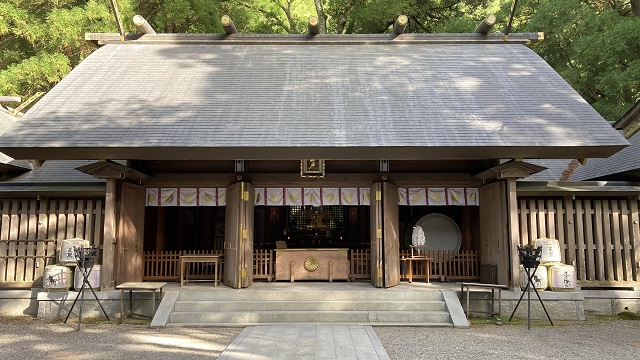 | 西本宮の拝殿です。 天照大神がお隠れなった御神体の「天岩戸」は、岩戸川を挟んで対岸の西本宮の拝殿から参拝します。 また、定期的に神職さんが「天岩戸」の前へ案内して下さります。 |