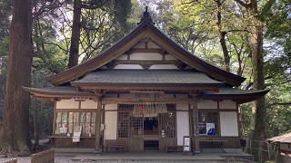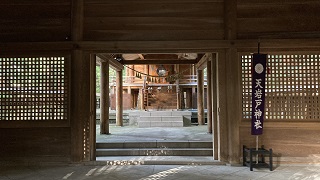 | 御神体「天岩戸」の拝殿です。拝殿の先には天照皇大神がお隠れになったとされる岩戸があります。 須佐之男命(すさのをのみこと)が大変な暴れん坊にお怒りになり天照大御神(あまてらすおおのかみ)が岩戸に隠れて、世の中が真っ暗になった。 八百万の神が集まり相談され岩戸の前で舞を舞い騒ぐと岩戸が開けられ世の中が明るくなったと言われる神話です。 西本宮には天照皇大神が祀られています。 |