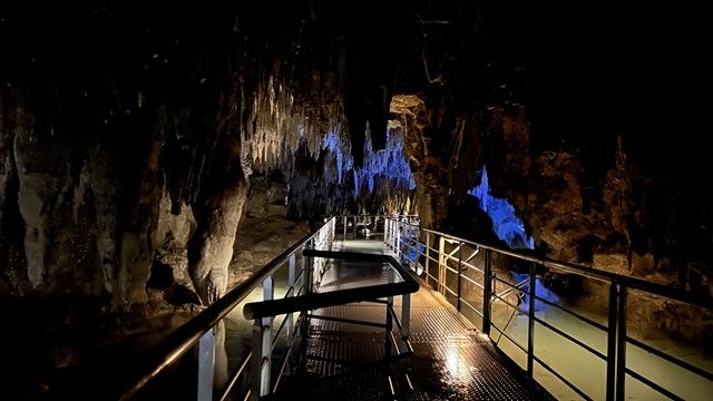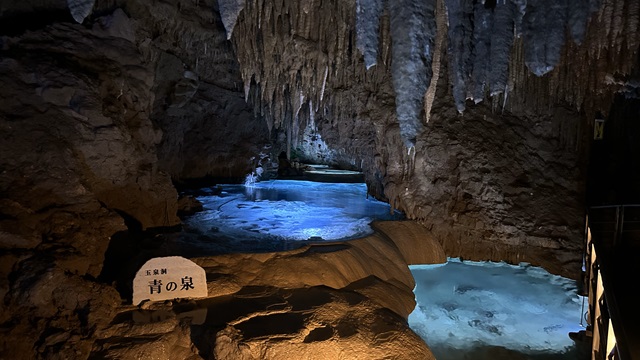 | 「青の泉」は玉泉洞の見どころの一つです。リムストーンと呼ばれる鍾乳石により、幾重にも連なる湖沼のような景観が生み出されました。リムストーンを流れる水の音や水面の揺らぎが、この場所の清逸な雰囲気を醸し出しています。 | ![]() |