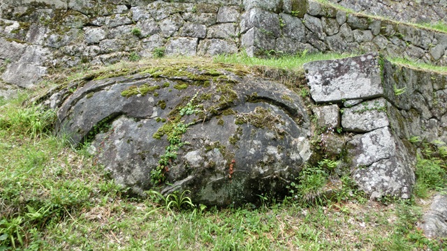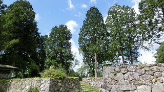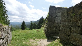 | その後も城主は入れ替わり1873年の廃城令により城は解体され石垣が残っていますが石垣の作り光景に圧倒されました。 石垣の間から望む光景は、山々に囲まれ空は高く自然の雄大さを感じられます。 |