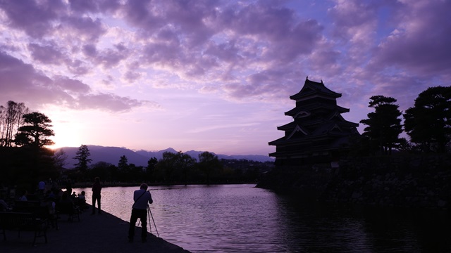 | 堀の外では夕刻の松本城天守閣を撮影しようと多くのカメラマンが三脚を広げその瞬間を待ち望んでいます。 アルプスの山々を背景に凛々しくたっています。 |