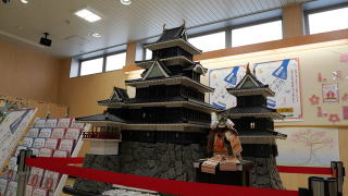 | 松本駅コンコースに観光センター内に飾られている“松本城の模型“があります。 松本市マスコットキャラは『アルプちゃん』で、松本城に掲げてある『アルプちゃん』は~甲冑version~です。 本来のお姿は、帽子は北アルプスの山がデザインされ、服は豊かな自然の緑で可愛らしく手にはバイオリンを持っています。 |