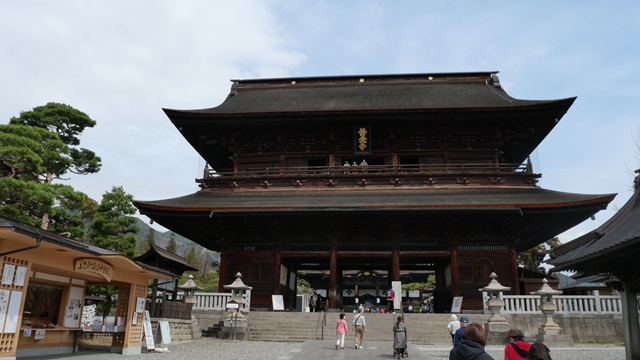 | 『山門』 参道に聳える『山門』は、京都知恩院や南禅寺の山門と比べても見劣りしない建物です。 日本三大三門は、京都南禅寺、東福寺と久遠寺とされています。 南禅寺:横幅50m、使高さ24m、用されている屋根瓦は約7万枚。 東福寺:幅約26m高さ約22mの、巨大建造物。 現存三門としては日本最古。 久遠寺:間口23m、奥行9m、高さ21m 知恩院:間口45m、奥行35m、周囲に幅3mの大外縁がめぐらされている。 善光寺:正面20メートル、高さ20メートル、奥行き7.8メートルの入母屋造り(いりもやづくり)の大楼門です。 |