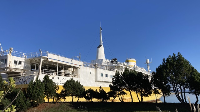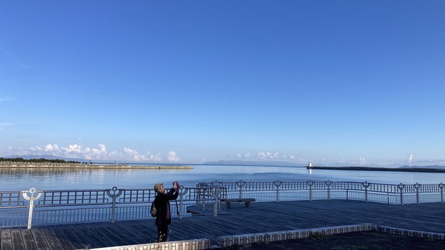 | 青森港は陸奥湾の中にあり波は凪いていて静かな海でした。 沖合に見える陸地は”下北半島”です。 |