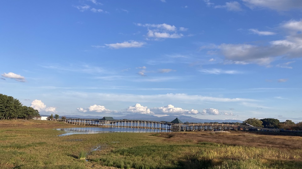 | 津軽富士(岩木山)の麓の富士見湖にかかる全長300mの日本一長い木造三連太鼓橋です。 長い木きの橋・長い木の橋と言うことで、この橋を渡ると長生きができる言われていて渡りに来ました。 鶴が羽を下ろして休息している姿を模しているとされています。 「鶴の舞橋」到着すると、ここも修復工事中でした。観光客も私たちを除いて一組で、「道の駅 鶴の里あるじゃ」も営業していなくて寂しい風景です。 交通手段がなく折角タクシーを飛ばして来たのに老朽化により補修工事中で橋を渡る事ができません。 |