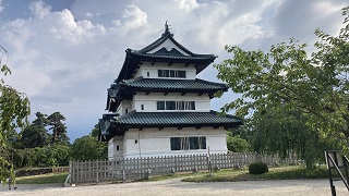 | 弘前の桜祭りが開催されていて、同僚たちは弘前城の桜まつり観光に行かれたが、私は、1984年「薬師丸ひろ子の探偵物語、Wの悲劇」「メインテーマ」の映画を観賞していました。この時、弘前が観光名所であると気にしていませんでした。 弘前藩の城下町。現存12天守閣の一つ。 1611年の築城ですが、天守閣はもととも5重の天守閣でしたが1627に落雷で焼失し櫓として造営された天守閣です。と云うことで思っていたより小さいです。 |