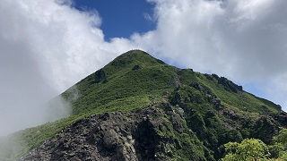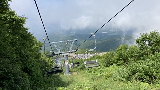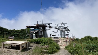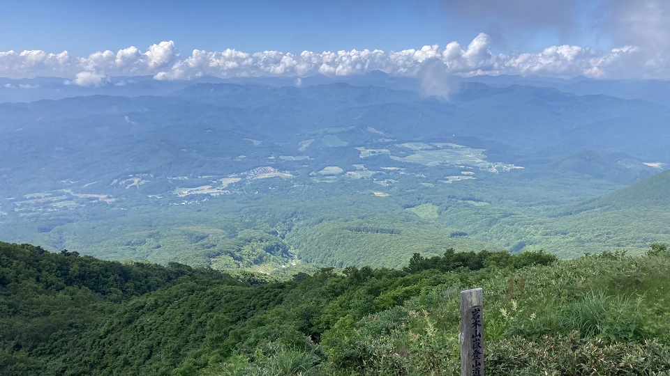 | 山頂まではまだ歩かなくてはならないが、ここでも十分展望でき楽しいです。 山肌では水蒸気が舞い上がり、大きな火口は崖のように側によると怖いくらいです。 山頂は真夏の青空のもと麓とは10℃以上低く清々しい。 遠くには白神山地が見えるし北海道を見ることができるでしょう。 前回は弘前からバスに乗って訪れました。バスの車窓からは多数のハンググライダーが飛んでいるのが見えて気持ち良さそうと感じたのを覚えています。 |