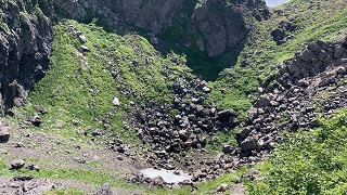 | 山頂から望むと裾が広がっていることで下界が足元に見えます。 | この火口の先に『岩木山神社 奥宮』が祀られてますが行くにはチョット無理があるので自嘲しました。 |