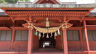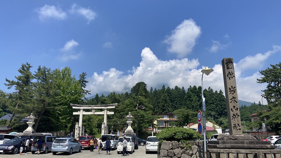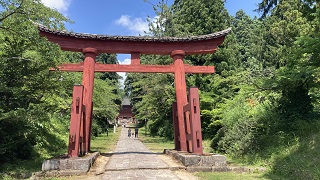 | 岩木山の麓の岩木山神社。 「一之鳥居」の先に雲に隠れているのが岩木山です。 「一之鳥居」から「本殿」まで一直線に配置され、見通せます。その先に岩木山が聳え山頂の『岩木山神社 奥宮』に続いています。 |