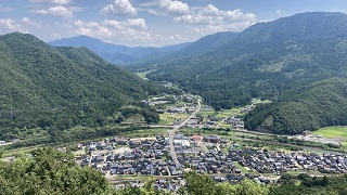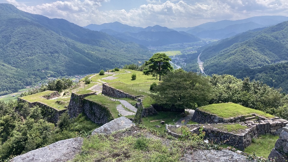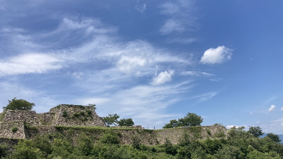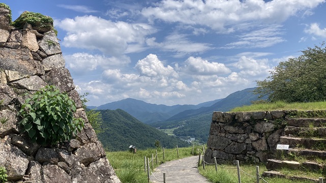 | 天守台に立つと大自然の息吹が感じられます。青空と対山々の緑、石垣と石垣の間から見渡す空の情景は天空です。 特に天守台から南千畳を眺めると、城壁が段差を構成し広がっている光景は、まさにマチュピチュ!。(行った事は無いが。) |