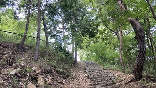 | 竹田城跡を堪能し帰りは表米神社登山道を下山することに挑戦しました。表米神社登山道の急勾配の坂を一歩一歩確認しながら約40分かけて下山しました。(翌日は足が痛くなりました。) ポスターなどで『雲海に浮かんでいる竹田城址』は、対面する朝来山の立雲狭から撮影されいます。城下町の民宿風Hotelが建ち並び、早朝の風景を撮影するために、早朝かられるために宿泊されるのだと思いました。 |