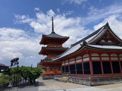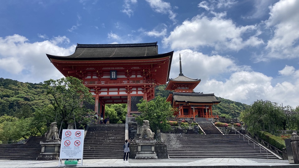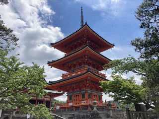 | 何度か参拝しました。四季折々の景観が楽しめるお寺です。 一大決心をで『清水舞台から飛び降りる。』あまりにも有名な清水寺。 五条坂を歩くと清水坂にでます。清水坂からはお土産さんが建ち並び賑わいがでてきます。八つ橋、油紙店を横目で通過すると仁王門と西門の前にでます。 仁王門前の石段の下は、仁王門と西門をカメラのフレームに収める構図が撮影ポイントで普段は修学旅行生や和服を着た観光客が沢山いますがCOVID-19で殆ど無人の状況で写真が撮影できました。 778年の創建。平安京遷都(794年)前に創建されています。桓武天皇を支え平安京守護神の征夷大将軍となった坂上田村麻呂が建立した清水寺です。 仁王門を潜り境内に入り、朱色の美しい三重塔を横切り、拝観受付所で拝観料を納めて轟門に到達します。 |