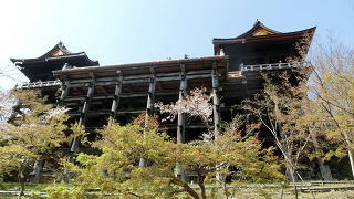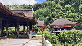 | 舞台から望む奥の院も優雅に見えます。 清水の舞台は高さ13メートルの清水の舞台。釘を使わない技法で組み立てられた舞台。 |