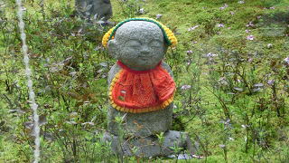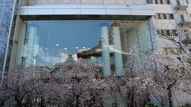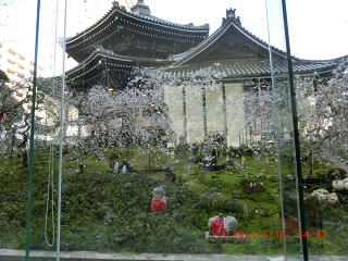 | また、ビルの一階にスターバックスがあります。。そのスターバックス店内の東側は一面透明ガラスで六角堂の本堂全貌が眺められます。しかし、窓ガラス側の席は混雑していて座ることが出来ません。(新型コロナ禍で一度だけ座ることが出来ました。) 4月には目の前の御幸桜の花が咲き、鳥が蜜を食べるたびに花びらがクルクル回って落ちていく光景を見る事が出来ます。それをお地蔵さんが優しく見守っているようです。これは必見です。 |