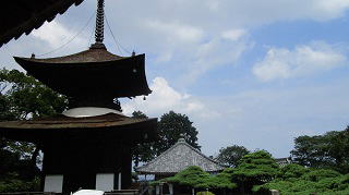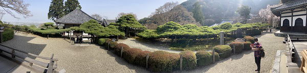 | 石段を登り格調高い立派な本堂(観音堂)の前に出ます。 本堂の右横の石段を登ると『遊龍の松』が迎えてくれます。 『遊龍の松』は樹齢600年、全長37mで龍が泳いでいように広がる一本の松です。本当に一本なのか注意してみましたが一本でした。 |