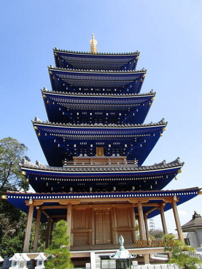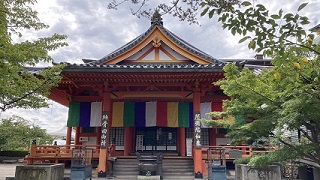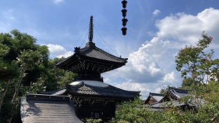 | 本尊は『十一面観世音菩薩』と左右にも十一面観音で合わせて三十三となり、ここをお参りすることで三十三霊場をお参りしたことと同じご利益が得られると言われます。 『紫雲たなびく』と紹介されています。これは念仏行者の臨終などにあたって、阿彌陀仏がこの雲に乗って来迎される。境内を見ると深い青色に塗られた五重塔は青龍塔と呼ばれ、まさに『紫雲がたなびている』と感じられます。 |