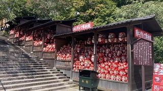 | 本堂への参道脇に「三間の勝ちダルマ奉納棚」が設置されています。大小のダルマが所狭しと奉納されています。 『勝ちダルマ』勝ちダルマは、あれこれ色々とお願いするのではなく、ただ一つのお願い事に対してあなた自身が直接目を入れる大切なお守りです。 勝ちダルマ「人生のあらゆる場面で勝つ寺」と「七転び八起きの精神」を唱え信仰されています。 |