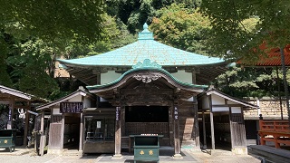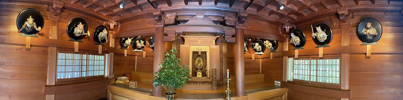 | 放生池を跨いだ対面に『大講堂』が建立されています。大講堂からは森林の緑が鮮やかに観賞できます。 「十一面観音」は、開山堂千人一刀三礼の秘仏で家内安全、心願成就の祈願です。 |