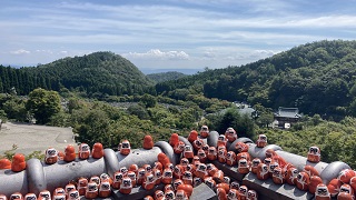 | 石段を何段も登り本堂にたどり着けます。 御本尊『十一面千手観世音菩薩』で毎月18日に厨子の扉が開き拝むことができます。 清和天皇の玉体安隠を祈って効験があったことから『勝王寺』の寺号を帝より受け賜わったことから『勝尾寺』となったと言われています。 そうすると吃驚!吃驚!境内に大きく鳴り響くお経が聞こえてきます。 本堂でお経を唱えている音声を参道横の木の陰などにスピーカが配置されそこからお経が聞こえます。 石畳の参道の脇には、石段の上、木の根っこ、小さなダルマが置かれています。 |
