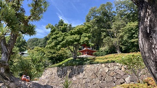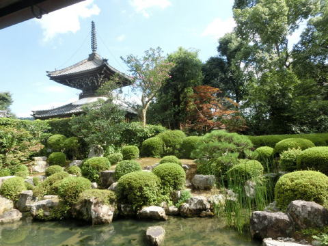 | 本尊となる聖観世音菩薩像は昭和43年に盗難にあったそうで現在行方不明とのことです。 早く戻ると良いですね。 穴太寺には屈指の名勝庭園があり、座って静かな庭を見ていると落ちつきます。また庭の先には多宝塔が覗き時代が遡った気がします。 |