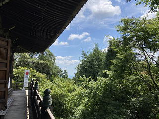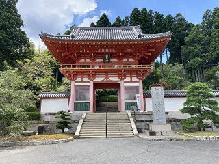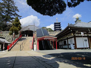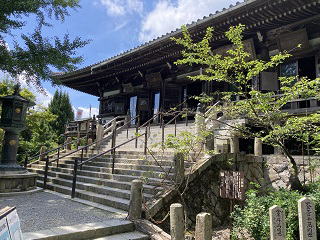 | 仁王門を潜ると舗装された参道があります。200mほどの石垣の参道を歩き売店の横を更に歩くと放生池にでます。放生池の周辺は静かで心地よい風景をしています。 西国三十三所第25番目の札所は大講堂に祀られている『十一面千手観世音菩薩』で、放生池の横の石段を上った先に本堂の根本中堂があります。推古天皇の勅願所で627年に創建され大正6年に再建されました。 本坊入口横に京都清水寺創建者の坂上田村麻呂をモチーフにした看板が掲げられてます。 |