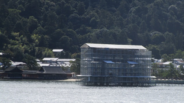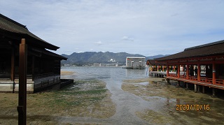 | 宮島自体が神とされて信仰されている。 厳島神社参拝に来ました。海に浮かぶ大鳥居を楽しみに訪れましたが、2019年6月に144年ぶりに大規模修繕工事で防御ネットに覆われ拝見することができませんでした。訪れる時は事前確認すべきと反省しています。 有名な大鳥居は潮が満ちているときは海面があり潮が引いているときは砂浜になっている。 |