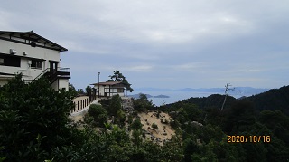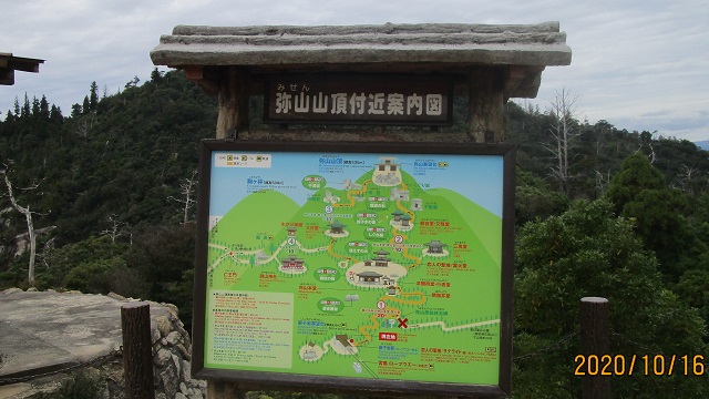 | 弥山(みせん)は広島県廿日市市宮島町の宮島(厳島)の中央部にある標高535 mの山。古くからの信仰の対象になっている。 弥山本堂の正式名称は、多喜山水精寺です。真言宗御室派の寺院で、厳島神社の別当であった多喜山大聖院の堂宇です。 厳島神社から15分ほど歩くと宮島ロープウェイ「紅葉谷」駅に着きます。ロープウェイで「獅子岩駅」に到着すると、そこは瀬戸内海を一望する獅子岩展望所になっています。 獅子岩展望台から見渡すとフタコブラクダのような先の山に寺院らしき建物が見えます。 |