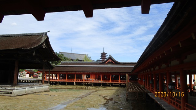 | また、社殿も潮が満ちたときの海面は社殿廊下の上まで浸食します。浸食時の波は社殿の廊下を走るので楽しみです。 1168年は天動説が信じられていた時代で、潮の満ち引き現象をどの様に解釈されていたのでしょうかな?。 |
